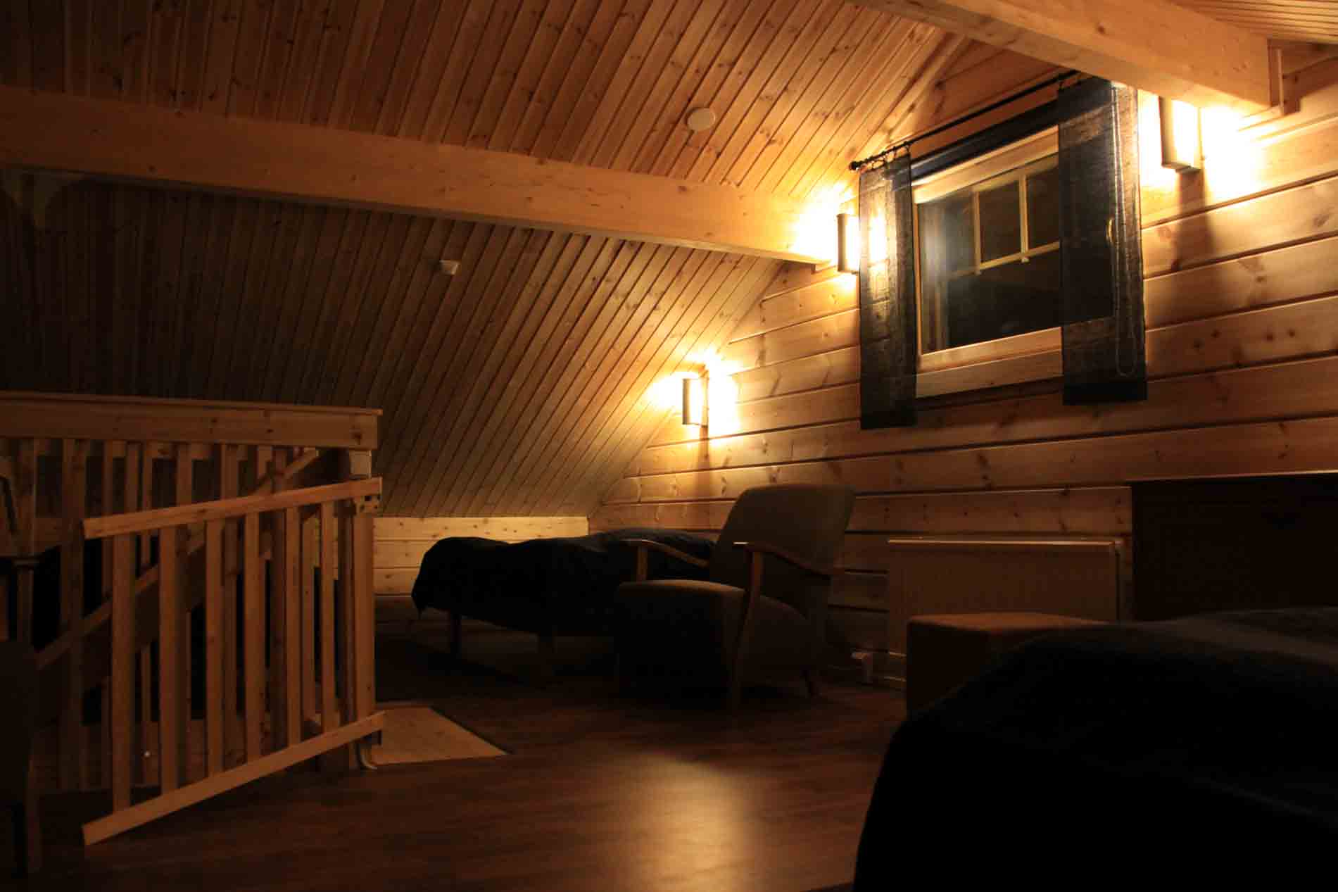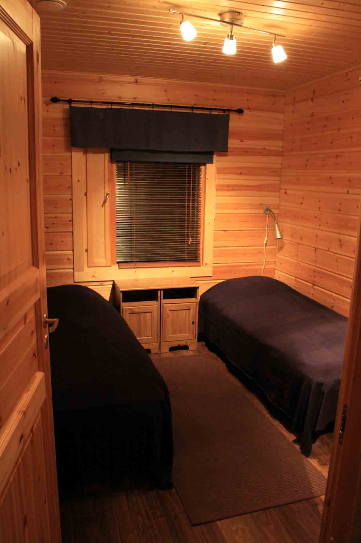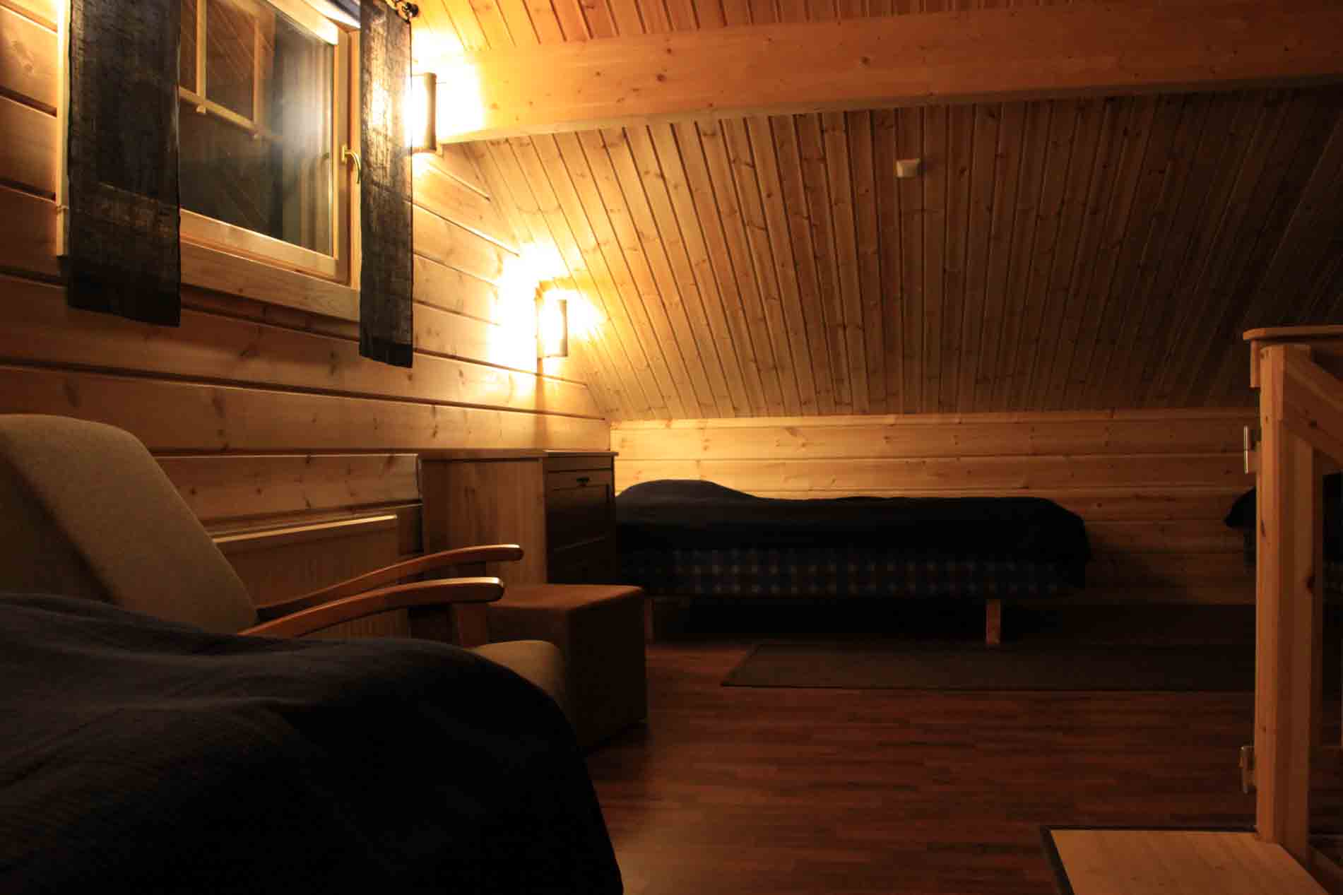 Alakerrassa kaksi kahden hengen makuuhuonetta. Parvella neljä leveää sänkyä.