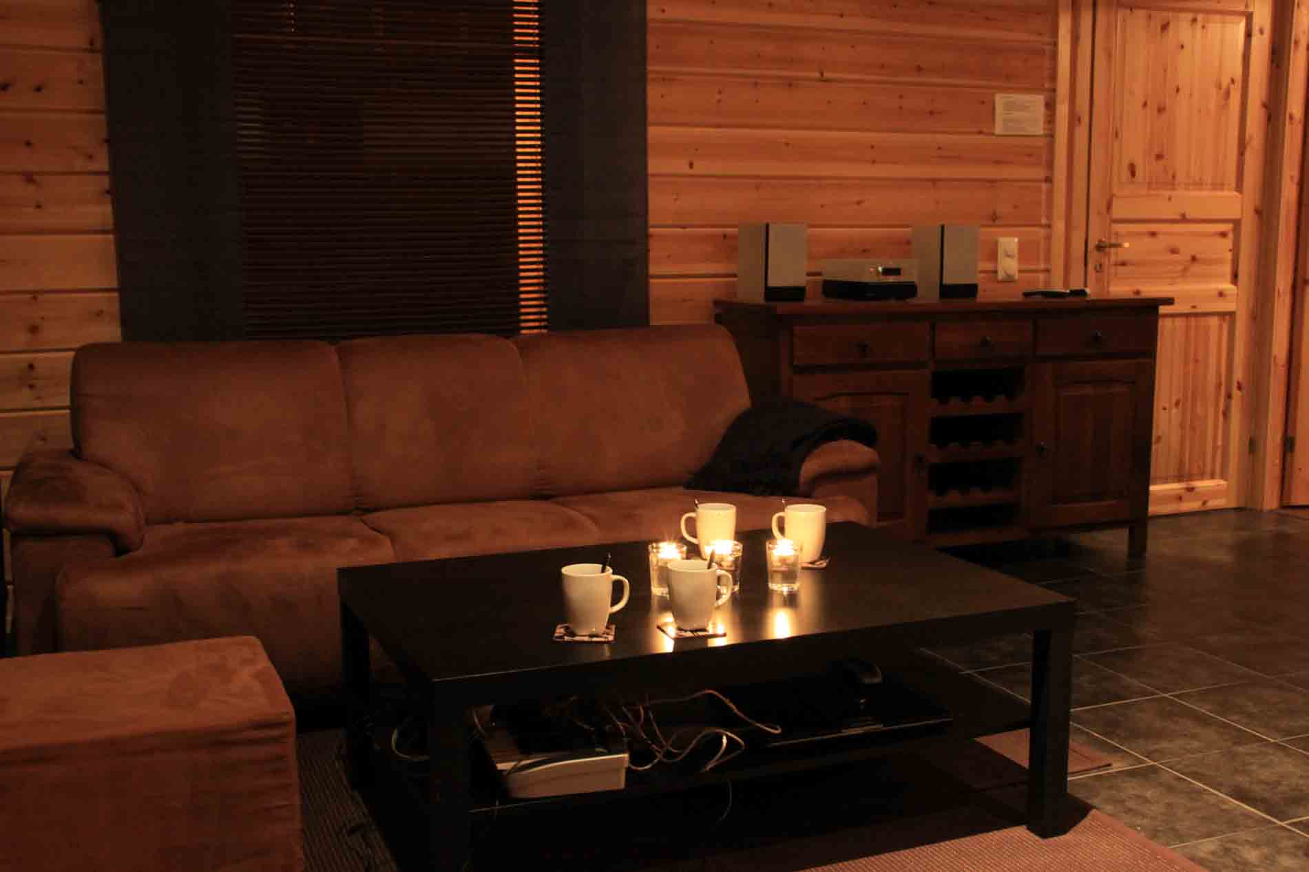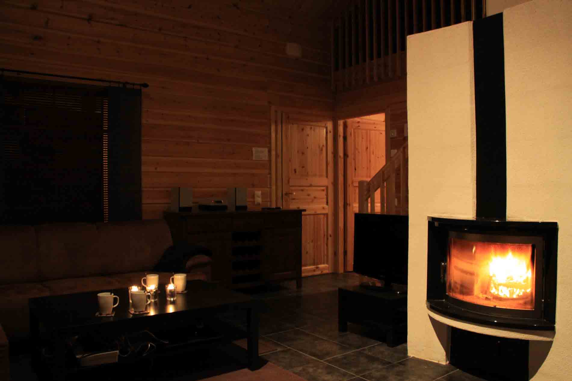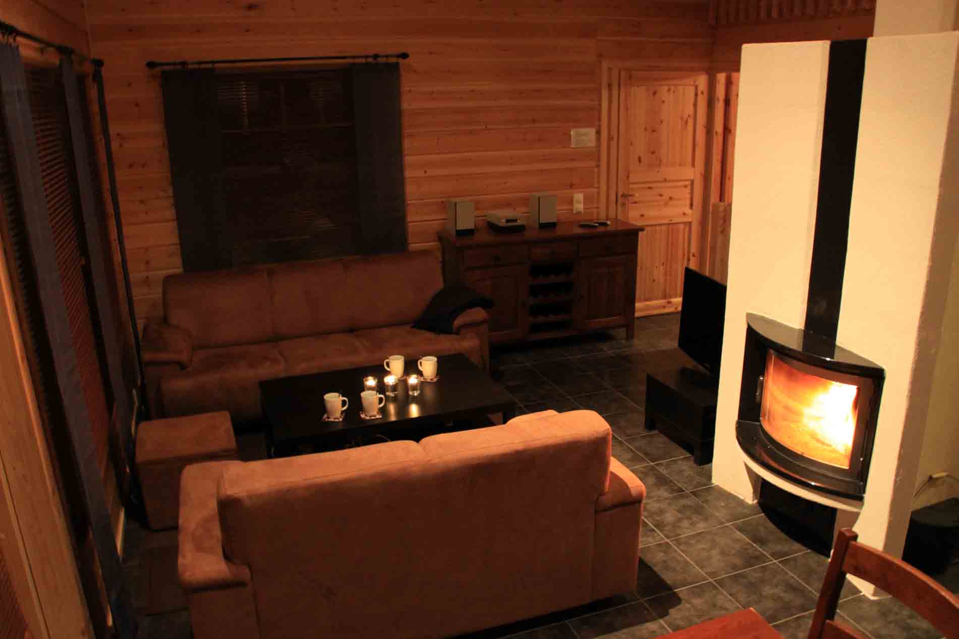 Mökissä lattialämmitys, takka, taulutelevisio, digiboxi, ministereot, dvd-soitin, sohvaryhmä.