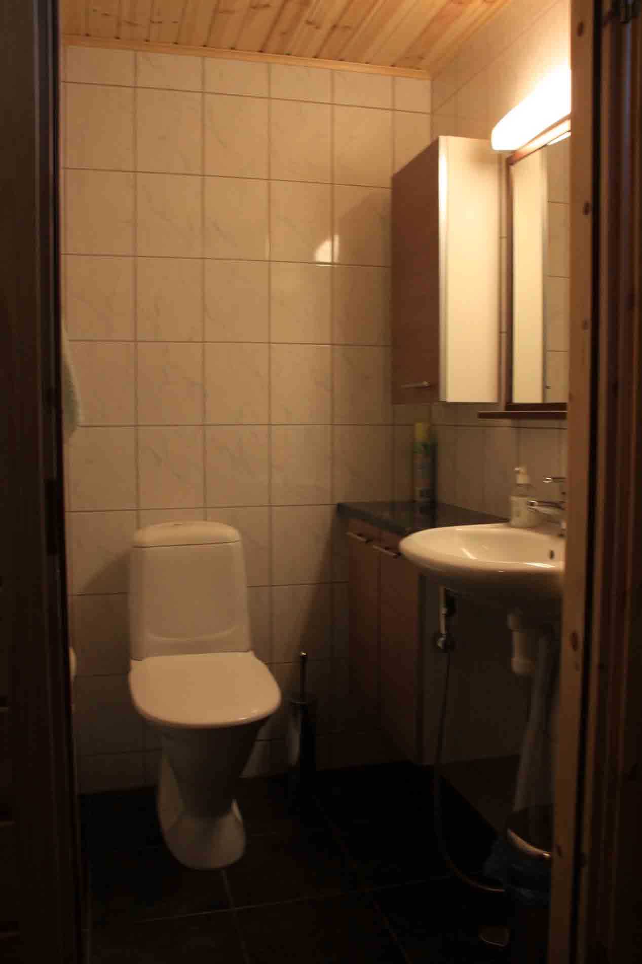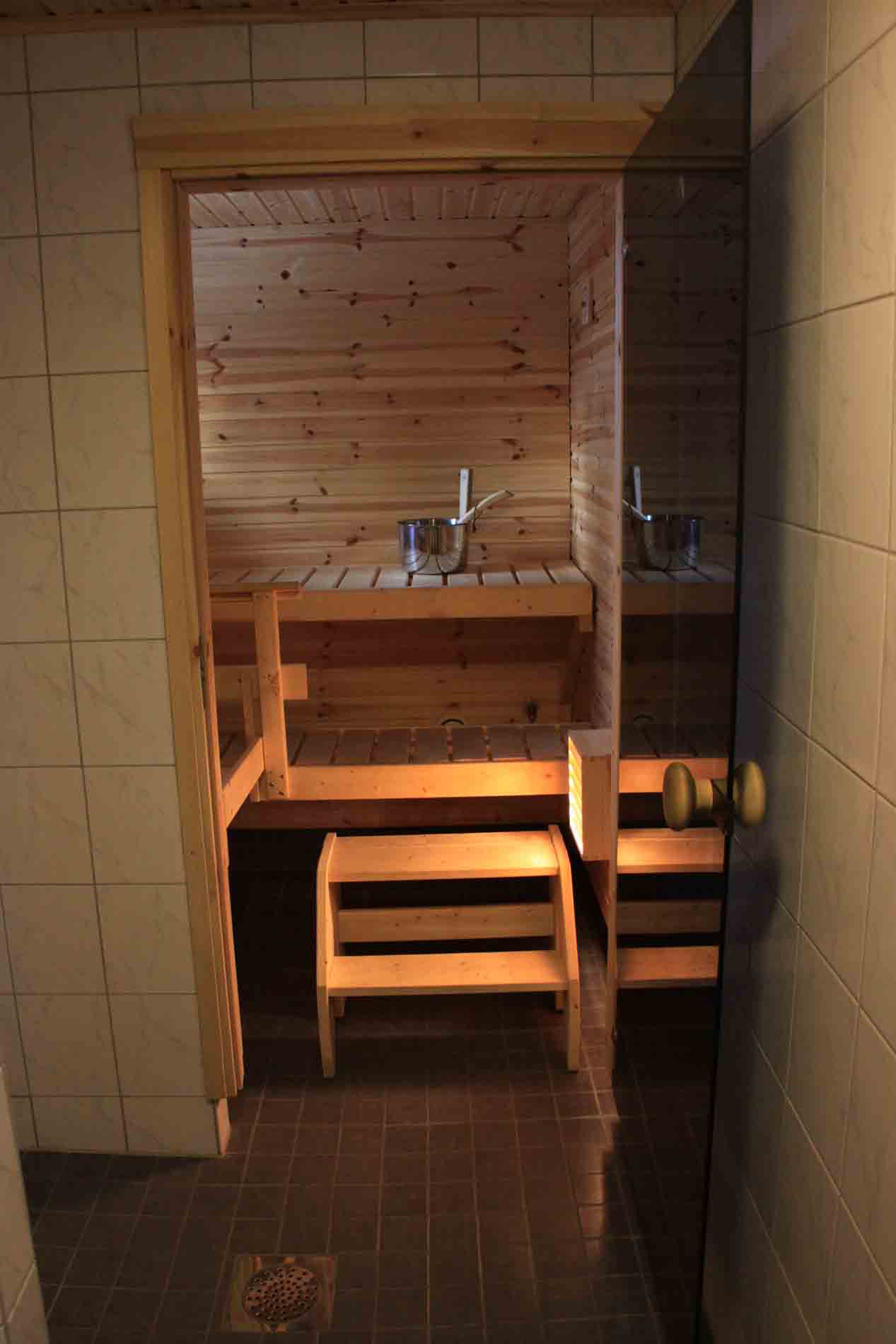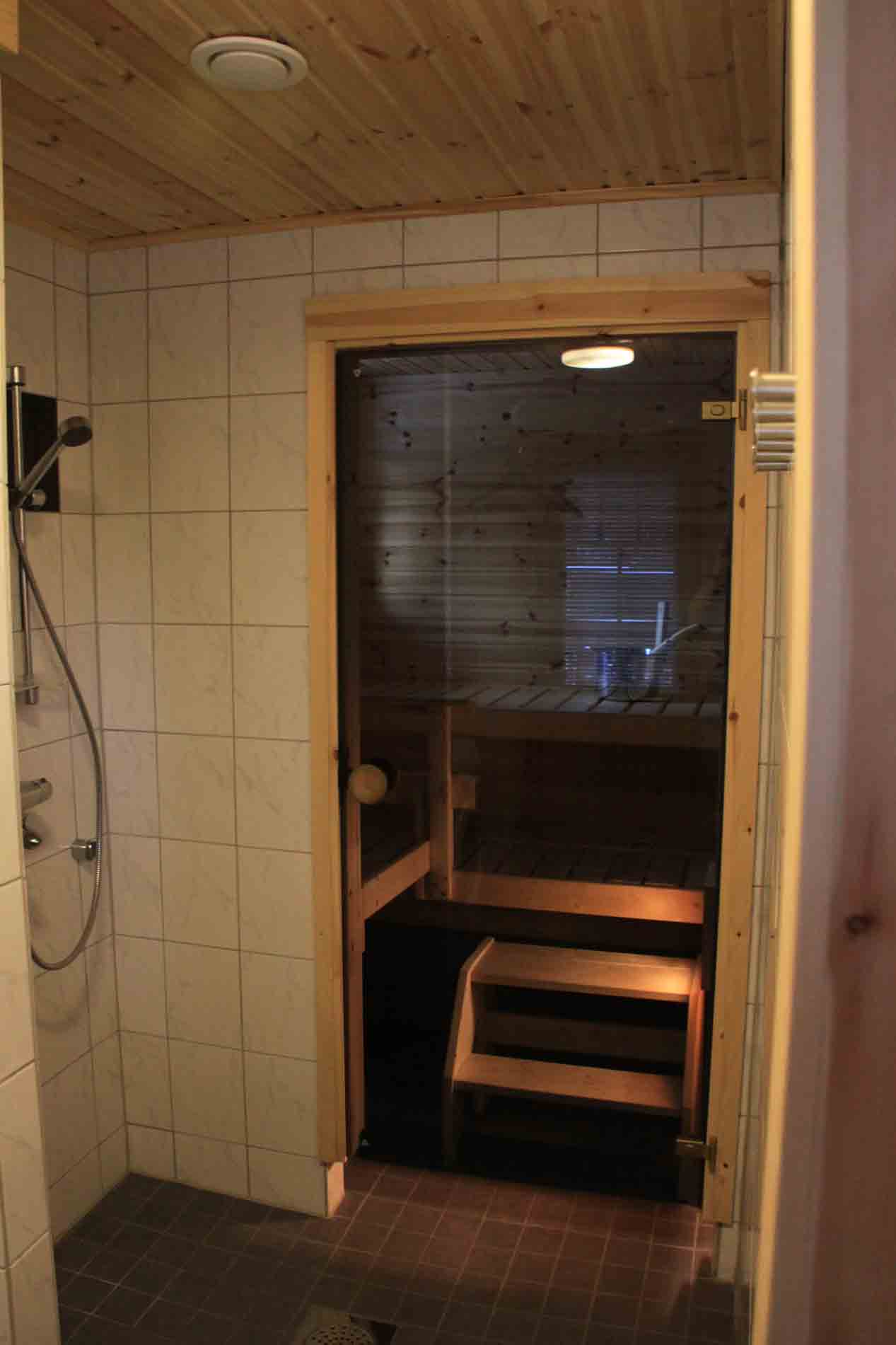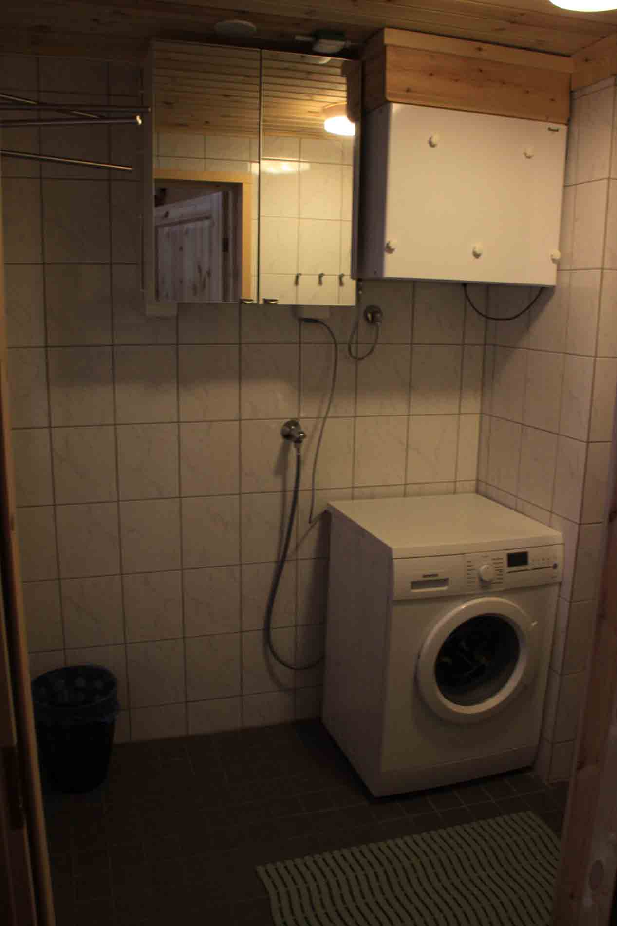 Sauna, suihku, wc, pesukone ja kuivauskaappi.